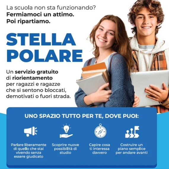 L’obiettivo di "Stella Polare" è quello di accompagnare i ragazzi che stanno vivendo situazioni di fragilità scolastica o motivazionale o che si trovino temporaneamente fuori dai percorsi scolastici alla riscoperta delle proprie potenzialità, per eventualmente definire un nuovo progetto di studio. Gli interventi saranno individualizzati e di breve durata, ma ad alta intensità relazionale; essi verranno condotti da parte di consulenti esperti di orientamento, professionisti qualificati con competenze pedagogiche, psicologiche e di counseling educativo, formati per operare con adolescenti e giovani in situazioni di disagio o discontinuità formativa.